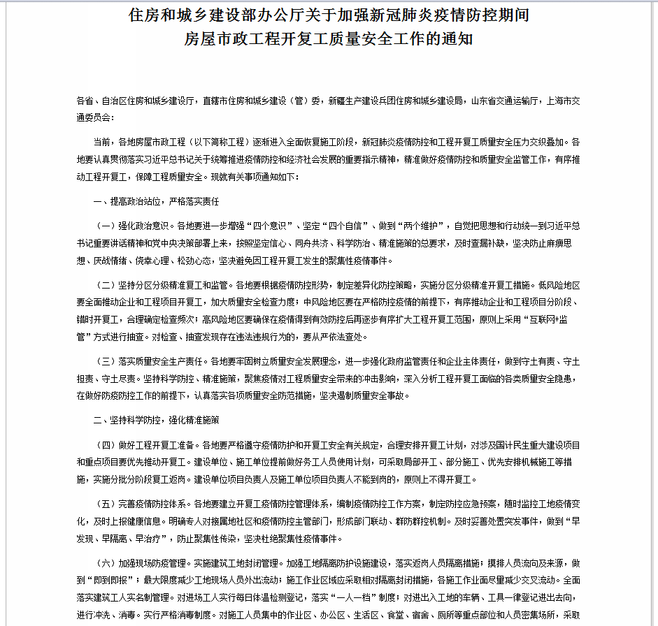 關(guān)于加強新冠肺炎疫情防控期間房屋市政工程開復工質(zhì)量安全工作的通知